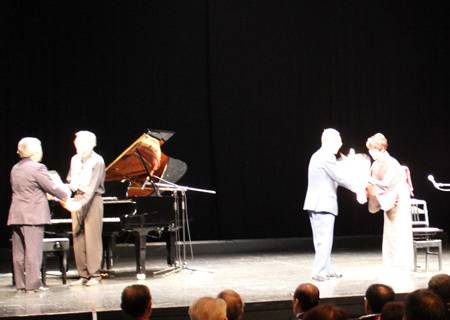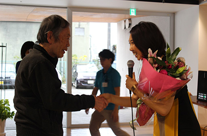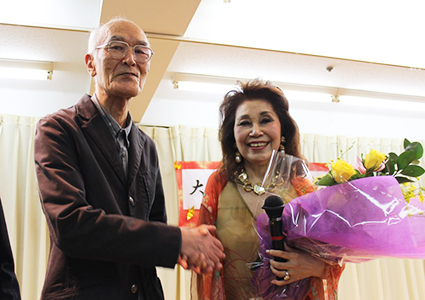 そして、会場から一斉にアンコールの掛け声があがり「見上げてごらん夜の星を」。笹子重治さんのつま弾く生ギターの繊細なイントロが流れると、大合唱が生まれました。美しいメロディーと歌詞が心に沁みて、涙があふれそうな顔もあちこちに見られましたが、みんなが幸せそうに見えた至福のひと時でした。全9曲、約一時間のコンサートを、中座する方もなく全員で楽しみ、代表の方から、大島さんと笹子さんに花束贈呈と記念撮影。「きれいな声ね」「心が洗われました」と感動の声があちこちから聞こえる中、大好評のステージは幕を閉じました。