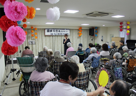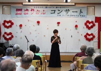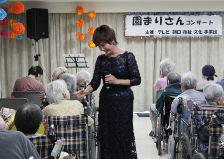 9月16日、町田市の特別養護老人ホーム「ケアセンター成瀬」に、園まりさんをお連れして歌謡ショーを開催しました。当日は、小雨が降り肌寒い日にもかかわらず、地下1階のコミュニティーホールには、デイサービスの利用者も含め、約90人のお年寄りが集まりました。歌謡ショーは、園まりさんの大ヒット曲「逢いたくて逢いたくて」からスタート、アンコール曲を含め全11曲を熱唱しました。園さんご自身の思い出が沢山つまった曲だという「ここに幸あり」を歌うと、参加者の中にも感極まって涙ぐむ人の姿が見られました。今年、敬老の日には、園さんが介護しているというお母さまが百歳の記念の表彰状と記念品を贈呈されたという嬉しい報告もありました。園さんは、中尾ミエさん、伊藤ゆかりさんとともに3人娘と呼ばれた国民的アイドルだったことも有名ですが、そのうちの一人中尾ミエさんのヒット曲「可愛いベイビー」を会場内を回りながら歌うと、お年寄りたちの手拍子と笑顔で溢れました。来年デビュー55年になるという園さん、昭和39年のヒット曲「何も云わないで」、人生の応援歌「愛燦燦」といった歌謡曲から、「里の秋」「ふるさと」などの童謡まで参加者といっしょに合唱しました。最後のアンコール曲「青い山脈」で会場から拍手喝采が沸き起こり、施設を代表したお年寄り2人から、それぞれ大きな花束が園さんに贈られ、記念の写真撮影を行って終演となりました。参加者から「ほんとうにありがとうございました」との感謝の言葉に送られて施設を後にしました。