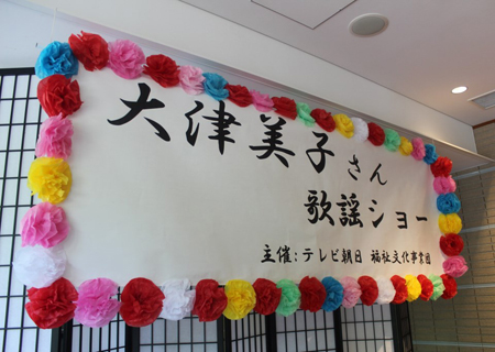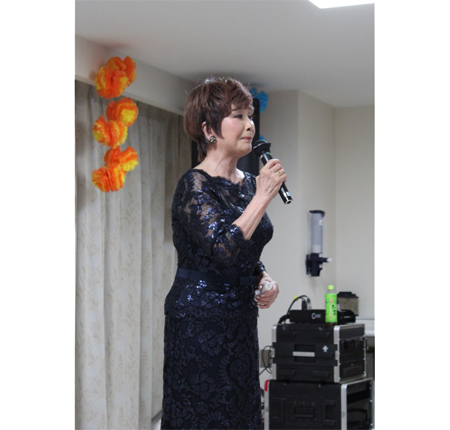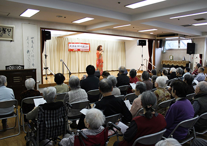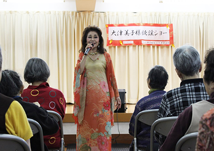 10月17日、大津美子さんが目黒区の養護老人ホーム「白寿荘」を訪問して歌謡ショーを開催しました。当日は、早朝からの激しい雨にもかかわらず、歌謡ショーをとても楽しみにしていた100人ほどの利用者が、施設の3階にある多目的ホールに集まりました。司会者の早川さんが大津さんを紹介すると、大きな拍手で歌謡ショーがスタート、全11曲を熱唱しました。事前にリクエストがあった「リンゴの唄」では、用意した歌詞カードを手に全員で合唱しました。デビュー曲の「東京アンナ」と「東京は恋人」では、ステージから降りて参加者に握手や声掛けをするなど、大津さんのやさしさに触れることができ、会場はお年寄りの笑顔で溢れました。また、大津さんご自身の健康法の一つである「腹式呼吸」を紹介すると、参加者は興味深げに耳を傾けていました。日本の名曲の中から、「恋の町札幌」「湖畔の宿」をメドレー唄い、昨年11月に発表した「夜空に光るあの星よ」では一緒に口ずさむ参加者もいました。ヒット曲「いのちの限り」「銀座の蝶」「グッド・ナイト」、大津さんの代表曲「ここに幸あり」を披露すると、感極まって涙を拭うお年寄りの姿も見られました。アンコールでは「サンパウロ.・チャチャチャ」を陽気に唄い、お年寄りの代表から大津美子さんに大きな花束が贈呈され、全員で記念写真を撮って終演しました。参加者から、「ほんとうにありがとうございました」とたくさんの感謝の言葉に送られて、雨が上がった施設を後にしました。
