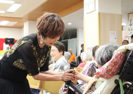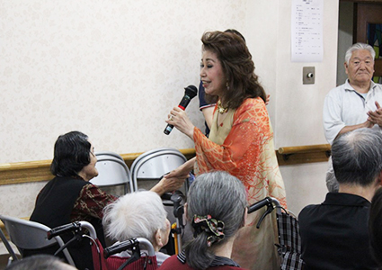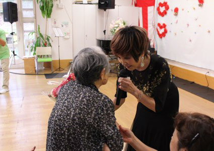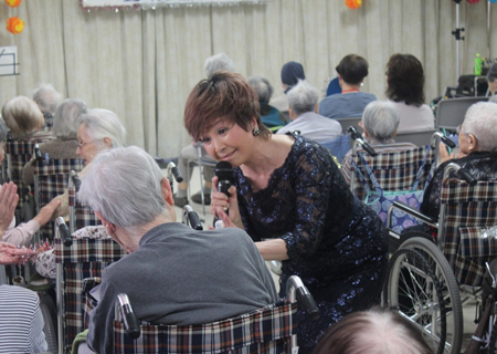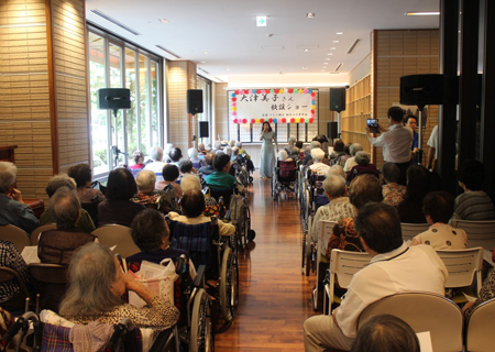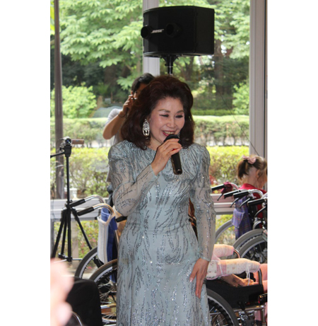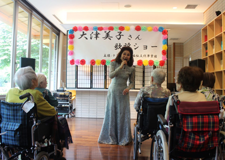 6月20日、立川市の特別養護老人ホーム「フェローホームズ森の家」に、大津美子さんをお連れして歌謡ショーを開催しました。当日は、初夏を思わせるような陽気になりましたが、デイサービス利用の方を含めて100人を超えるお年寄りが集まりました。司会者の早川さんが大津さんを紹介すると大きな拍手で歌謡ショーがスタート、「東京アンナ」「愛の詩を花の詩を」など全10曲を熱唱しました。お年寄りたちが、歌謡ショーために用意した歌詞カードを手に、全員で「リンゴの唄」を合唱すると、会場は笑顔で溢れました。「立川市に来たのはほんとうに久しぶり」という大津さんは、昨年発表した歌手生活60周年記念の新曲「夜空に光るあの星よ」をしみじみと唄い上げました。会場の中をゆっくり歩きながら大ヒット曲「銀座の蝶」「グッド・ナイト」を唄った後、ラストに代表曲「ここに幸あり」を披露すると感極まって涙を拭うお年寄りの姿も見られました。最後に恵比寿会の森山理事長から大津美子さんに花束が贈呈され、全員で記念写真を撮って終演しました。参加者から大津さんへの感謝の言葉をたくさん頂きました。
