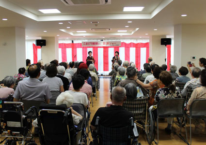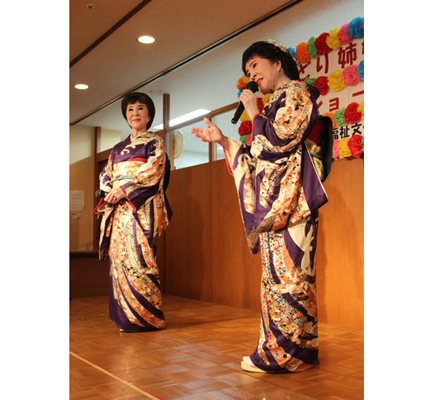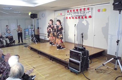 9月5日、豊島区の特別養護老人ホーム「千川の杜」にこまどり姉妹さんをお連れして、歌謡ショーを行いました。当日は、残暑が厳しい蒸し暑い日になりましたが、会場となった「地域交流スペース」には、デイサービスの利用者や地域の人たちを含めて100人を超えるお年寄りが集まりました。歌謡ショーは、「ソーラン渡り鳥」から始まり、デビュー曲の「浅草姉妹」「三味線姉妹」など全9曲を熱唱、姉の栄子さんが、川中美幸さんの代表曲で「二輪草」の踊りを披露するなど盛りだくさんの内容で、会場は拍手喝采、お年寄りの笑顔で溢れました。また、北海道出身のこまどり姉妹さんが夜逃げ同然で上京した時の苦労話や33歳の時のがんの闘病生活などの話に、参加者は真剣な表情で聞き入っていました。後半には、三味線コーナーもあり、三味線の生演奏で「お吉物語」「岸壁の母」「湯島の白梅」を唄うと、会場から手拍子と大きな掛け声が上がり、一緒に唄うお年寄りの姿も見られました。最後に「こまどりのラーメン渡り鳥」を唄った後、施設代表のお年寄り2人から花束が贈呈され、参加者全員と記念撮影を行い終演となりました。参加者から「ほんとうに楽しかった。ありがとうございました」と感謝の言葉を頂き、施設を後にしました。