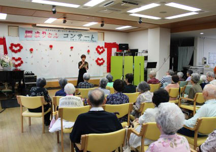 6月6日、武蔵野市の特別養護老人ホーム「ケアコート武蔵野」で、園まりさんの歌謡ショーを開催しました。前日に、梅雨入りしどんよりした曇天にもかかわらず、「ケアコート武蔵野」の多目的ホールには、歌謡ショーを楽しみにしていた約70人のお年寄りが集まりました。園まりさんの大ヒット曲「逢いたくて逢いたくて」からスタートして、「ここに幸あり」などアンコールを含めると全13曲を熱唱。ご自身が介護しているという99歳になるお母様のことなど貴重な話も聞くことができ、予定時間を少しオーバーし1時間余りの会となりました。今回は、「ヴァケーション」「太陽はひとりぼっち」などお年寄りが元気になるような軽快な曲も披露、昭和39年に発表したヒット曲「何も云わないで」を唄い終わった園さんは今年でデビュー54年を迎え、「こんなに永く唄わせてもらえるとは思ってもいなかった」と感慨深げにこれまでの人生を振り返っていました。そして「ふるさと」「青い山脈」「夢は夜ひらく」「スタンド・バイ・ミー」などを参加者といっしょに合唱。お年寄りたちと握手したり、声をかけたりしながら客席を回ると、会場にお年寄りの笑顔が溢れました。最後に、アンコールで「逢いたくて逢いたくて」を再び唄うと、会場は拍手喝采となり、施設を代表して、96歳のお年寄りから大きな花束が園さんに贈られ、記念の写真撮影を行って終演となりました。「ほんとうに感激しました」「貴重なお話に励まされました」との感謝の言葉に送られて、施設を後にしました。