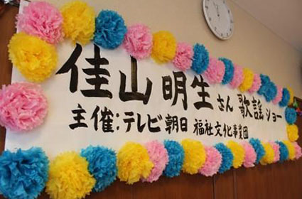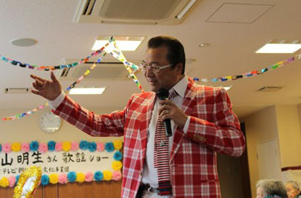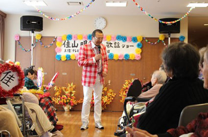 5月23日、渋谷区の特別養護老人ホーム「けやきの苑・西原」を、佳山明生さんが訪問して歌謡ショーを行いました。当日は今年初めての真夏日を記録し汗ばむような陽気でしたが、それでもホームの入居者やデイサービスの利用者など、80人前後が集まりました。佳山さんの代表曲「氷雨」から歌謡ショーがスタートして、歌謡曲を中心にして全8曲を熱唱。美川憲一さんとのデュエット曲「泣きながら夢を見て」も、カラオケに録音された美川さんの歌声に合わせて披露してくれました。「こんな女のブルース」では、ステージから降りて握手をしながら一緒に唄い、会場内のお年寄りを励ましました。また、佳山さんの軽快な話術には会場が笑いの渦に包まれ、たくさんの笑顔が溢れました。佳山さんは、作曲家・古賀政男氏の最後の門下生。古賀氏作曲の代表曲「無法松の一生」や、即興で「悲しい酒」をアカペラで唄うと、会場から自然と手拍子が、そして最後には拍手喝采に。ショーのラスト曲は「ともだち」でしたが、唄い終わってもアンコールを求める拍手が鳴りやまず、もう一曲「こころの翼」を唄っていただきました。最後に、施設の代表のお年寄りから大きな花束が贈られ、参加者全員と記念撮影を行って、参加者の「楽しかった。」「ありがとうございました。」との温かい言葉に声に送られながら、施設を後にしました。