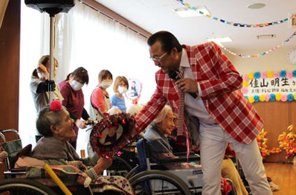 11月8日、秦野市の特別養護老人ホーム「田原の里」に、佳山明生さんをお連れして歌謡ショーを行いました。当日は秋が深まり少し肌寒い日でしたが、すぐ近くに富士山がうっすらと見える好日となりました。会場となった多目的ホールには、デイサービスの利用者や近隣の人たちなども含めて、約100人が集まりました。佳山さんが、ピンク色のストライプ柄の派手な衣装で登場すると、拍手喝采で歌謡ショーがスタート。「男のつぶやき」など、歌謡曲を中心にして全7曲を熱唱しました。美川憲一さんとのデュエット曲「泣きながら夢を見て」では、カラオケから流れる美川さんの女性パートに合わせて佳山さんが男性パートを歌いました。また、お姉さんが5人もいる佳山さんが、家族に接するようにやさしく語りかけたり、面白い話をすると会場はお年寄りの笑顔で溢れました。代表曲「氷雨」では、一人一人と握手をしながら会場を回り、握手した手をなかなか離さないお年寄りに、佳山さんがおどけてたしなめる場面もありました。佳山さんは、古賀政男氏の最後の門下生。古賀氏が「男のロマンを歌った曲」と云った「無法松の一生」も披露してくれました。続いて歌った新曲「夢には夢を 花には花を」は、年末の日本作詩大賞にノミネートが決まっているとのこと。歌謡ショーのラスト曲は「こころの翼」でしたが、歌い終わってもアンコールを求める拍手が鳴りやまず、もう一曲河内康範が作詞作曲した「ともだち」を歌い終わると、「好きな歌を歌えることに感謝している」と感慨深げな様子でした。最後に、施設を代表した100歳のお年寄りから大きな花束が贈られ、その後参加者全員と記念撮影を行いました。「ほんとうに楽しかった」「ありがとう」など、沢山の感謝の言葉に送られて施設を後にしました。