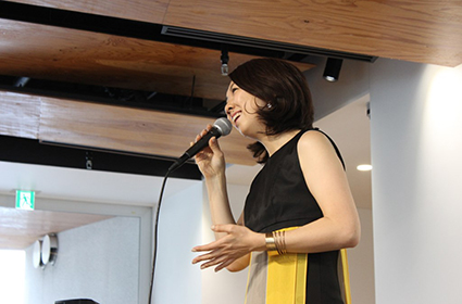 午後1時半、真ん中の通路から、黄色と黒のハイセンスなドレスで大島花子さんが登場!斬新なデザインの空間に映え、来訪を待ち望んだ方々に拍手で迎えられました。