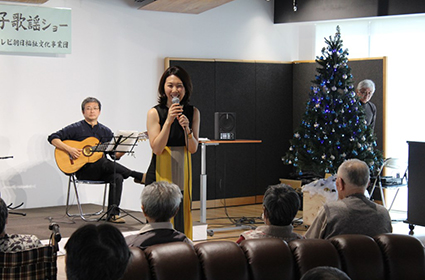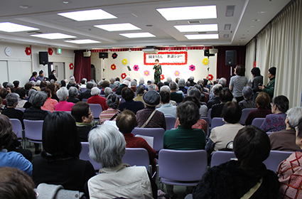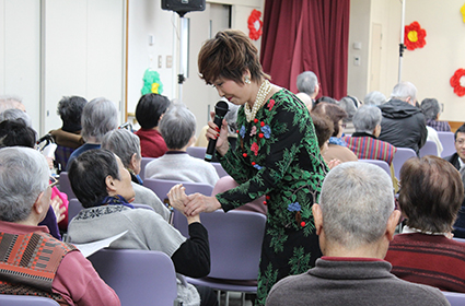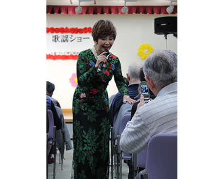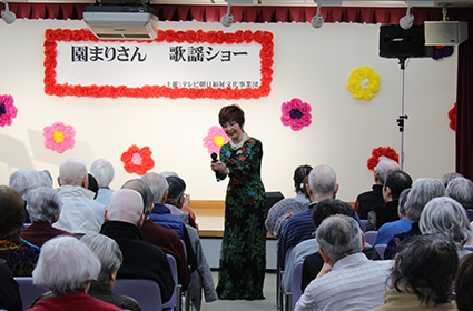 1月25日、大田区の養護老人ホーム「大森老人ホーム」で、園まりさんの歌謡ショーを開催しました。冬本番の厳しい寒さにもかかわらず、「大森老人ホーム」の多目的ホールには、昨年末から歌謡ショーを楽しみにしていた利用者や地域の方々、職員など約170人が集まりました。園まりさんの大ヒット曲「逢いたくて逢いたくて」のイントロが会場に流れ、園さんが登場すると拍手喝采で歌謡ショーがスタートしました。「ここに幸あり」などアンコールを含め全11曲を披露しました。ご自身が介護していた99歳のお母様が昨年末に亡くなられたという悲しい報告もありましたが、「いろんな人にありがとうを言いたい。死ぬのは怖いことではないのでは」と決意を新たに自らを鼓舞しているようにも見えました。予定時間を少しオーバーしましたが、約1時間の記憶に残る素晴らしいショーとなりました。今回も「ヴァケーション」「可愛いベイビー」などポップな明るい曲や昭和39年に発表したヒット曲「何も云わないで」など、「こんなに永く歌わせてもらえるとは思ってもいなかった」とこれまでの歌手生活を振り返り、感慨深げな様子でした。また、参加者と一緒に、用意した歌詞カードを使って「ふるさと」「里の秋」「夢は夜ひらく」「スタンド・バイ・ミー」を手拍子と共に合唱しました。園さんがお年寄りたちに、声をかけたり握手をしながら場内を回ると、周りはお年寄りの笑顔で溢れました。最後に、アンコールで「青い山脈」を皆でもう一度合唱した後、施設を代表したお年寄りから大きな花束が園さんに贈られ、記念の写真撮影を行って終演となりました。