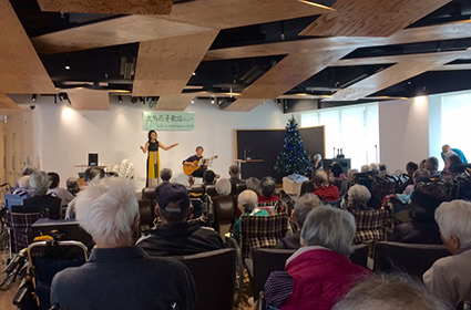 朝降っていた雨も小田原に着く頃には上り、晴れ間が覗き始めた師走初日の12月1日、特別養護老人ホーム「ジョイヴィレッジ」に大島花子さんを迎え、コンサートを行いました。2年前にオープンしたこの施設の設計は、歌舞伎座や新国立劇場で今話題の建築家、隈研吾氏。一階の多目的ホールは、天井までガラス張りで、ススキ野原や東海道本線の電車が走るのが見える開放的な造り。柱もなく、まるで自然の中にいるような心地よくモダンな空間です。