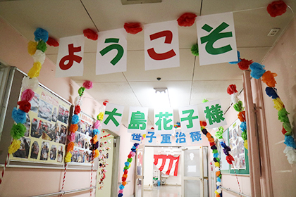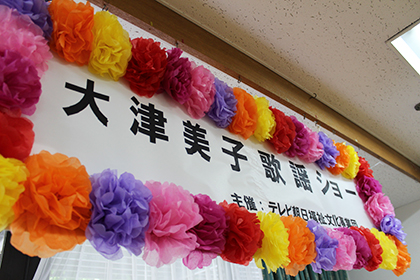 玄関や廊下には「歓迎!大島花子さん、笹子重治さん」と大きく書かれた文字に手作りのお花がたくさん添えられ、この日を心待ちにされたことが伺えます。ご尊父坂本九さんの大ヒット曲や大島花子さんのアルバムの中の名曲、施設のリクエストなど全10曲、1時間のショーを100人の皆さんが楽しみました。