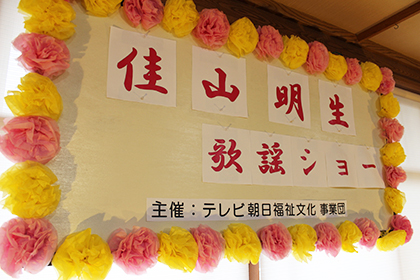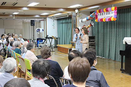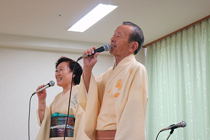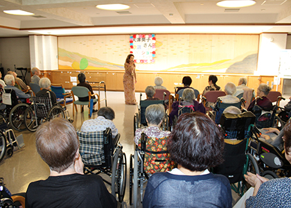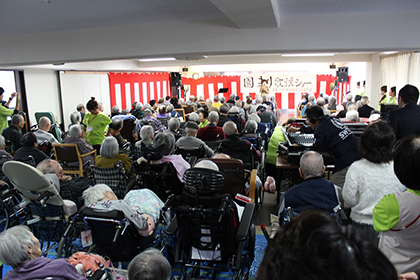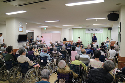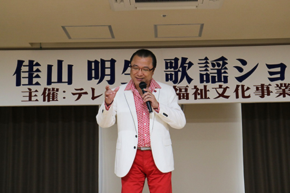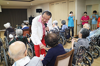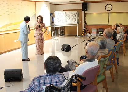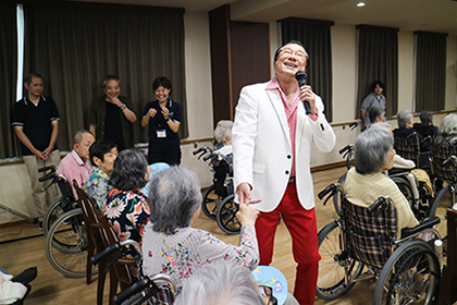 8月10日、葛飾区の特別養護老人ホーム「スマイルホーム西井堀」に、佳山明生さんをお連れして歌謡ショーを行いました。連日のように猛暑が続いた8月、この日も最高気温34度を記録する激しい暑さに見舞われましたが、会場となった施設内の地域交流スペースに、利用者やその家族など約130人が集まりました。