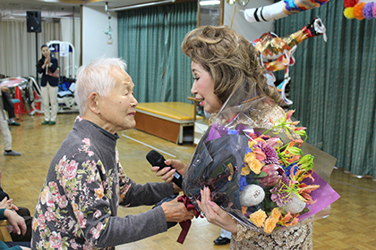 最後に、施設を代表した最高齢の102歳6ヶ月の利用者さんから大きな花束が贈られ、参加者全員と記念撮影を行いました。「ほんとうに良かった」「とても歌がうまっかった」「とても楽しかった」など、たくさんの感謝のお言葉を頂きました。