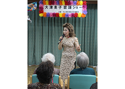 司会者の早川さんが大津美子さんを紹介すると、待ちかねた利用者の皆さんの大きな拍手で歌謡ショーがスタート。シックな花柄の衣装で「リンゴの唄」を歌いながら登場し、デビュー曲「東京アンナ」、当時の集団就職で上京した若者たちが元気が出るようにとの思いから歌った「東京は恋人」など、往年のヒット曲を歌いました。また、大津さんの「くも膜下出血」で病に倒れ、その後のリハビリによって奇跡的にカムバックを果たすことができた体験談に、参加者たちは大変励まされたようでした。日本の名曲の中からメドレーで、「恋の町札幌」「湖畔の宿」「さよならルンバ」を唄い、歌手生活60周年記念の「夜空に光るあの星よ」、最近発表したばかりの新曲「北斗星に祈りを」を熱唱しました。往年のヒット曲「銀座の蝶」「いのちの限り」「グッド・ナイト」に続いて、大津さんの代表曲「ここに幸あり」では、感極まって涙ぐむお年寄りの姿が多くみられました。