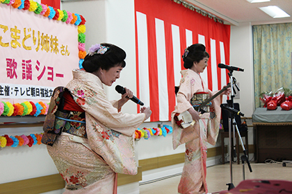 こまどり姉妹さんが、ゴールドの派手なキンキラ衣装で登場すると、大きな拍手で歌謡ショーが始まりました。代表曲「ソーラン渡り鳥」「浅草姉妹」「三味線姉妹」「未練ごころ」など全部で7曲を熱唱しました。また、姉の栄子さんが、川中美幸さんの「二輪草」の曲に合わせて素晴らしい踊りも披露しました。三味線コーナーでは、三味線の生演奏で妹の敏子さんが「岸壁の母」を熱唱。一緒に歌を口ずさんだり、感激して涙ぐんだりするお年寄りの姿が見られました。