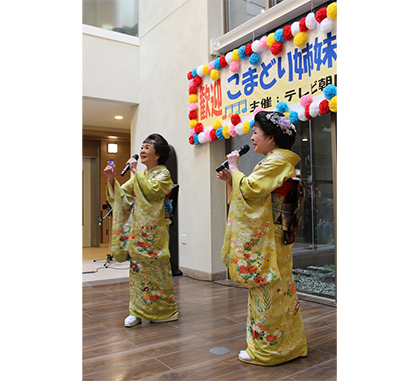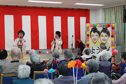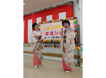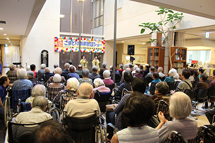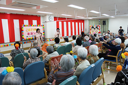 10月17日、北区の特別養護老人ホーム「新町光陽苑」を訪問して、こまどり姉妹さんの歌謡ショーを開催しました。当日は、朝から抜けるような秋空の下、歌謡ショーを心待ちにしていた利用者、地域の方々など100人ほどが1階のラウンジに集まりました。