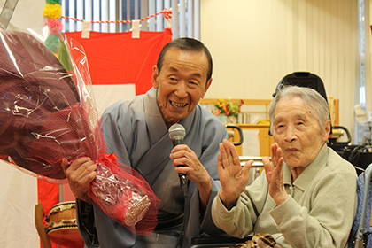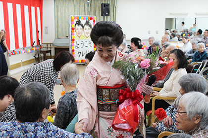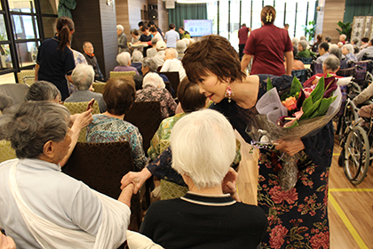 園まりさんは、中尾ミエさん、伊藤ゆかりさんとともにスパーク3人娘と呼ばれた、国民的アイドルでした。その3人娘が昨年12年ぶりに再結成。当時のツイストのヒット曲「太陽はひとりぼっち」を会場内を歩きながら陽気に歌うと、お年寄りたちの手拍子と笑顔で溢れました。また、施設が用意した歌詞カードを手に「ふるさと」「青い山脈」を合唱すると会場に一体感が生まれ大変盛り上がりました。往年のヒット曲「夢は夜ひらく」、「逢いたくて逢いたくて」、そして人生の応援歌「愛燦燦」を最後に歌うと会場から拍手喝采。施設を代表した車椅子のお年寄りから大きな花束が園さんに贈られました。
