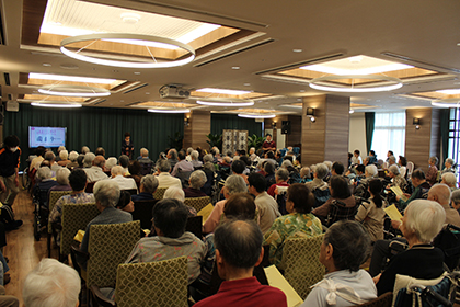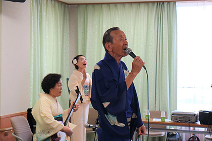 7月18日、東京都稲城市の特別養護老人ホーム「ひらお苑」に原田直之さんをお連れして、民謡・歌謡ショーを開催しました。連日の猛暑にもかかわらず、民謡ショーを楽しみにしていたデイサービスの利用者や関係者を含めて110人ほどが、会場に集まりました。