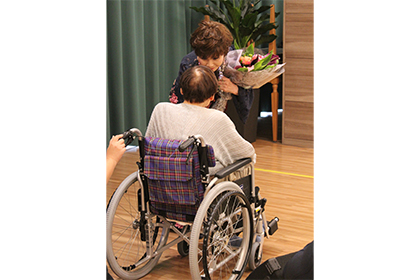 最後に、利用者の代表から、大津美子さんに綺麗な花束が贈呈され、全員で記念写真を撮って終演となりました。職員の方から「ほんとうに素晴らしい機会をありがとうございました」と感謝の言葉を頂き、施設を後にしました。