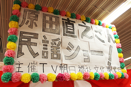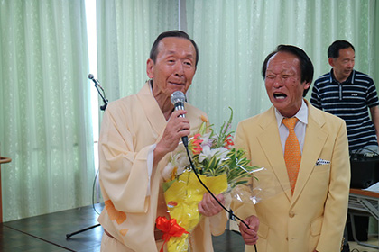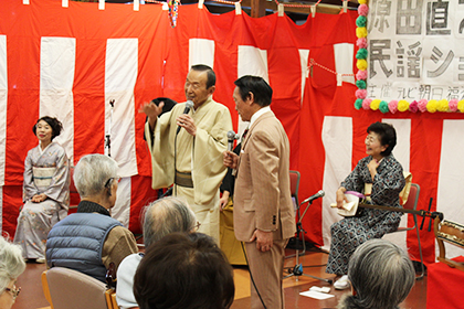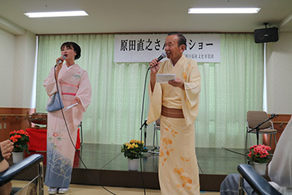 ここからは歌謡曲のコーナー。 三橋美智也さんの「達者でナ」を披露した後、原田さんと奥様とのデュエット曲、「ある夫婦のうた」を二人で笑顔でデュエットすると、会場はお年寄りの笑顔で溢れました。また、東日本大震災復興支援ソング「花は咲く」を、会場の皆さんと一緒に歌いあげました。