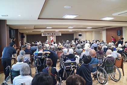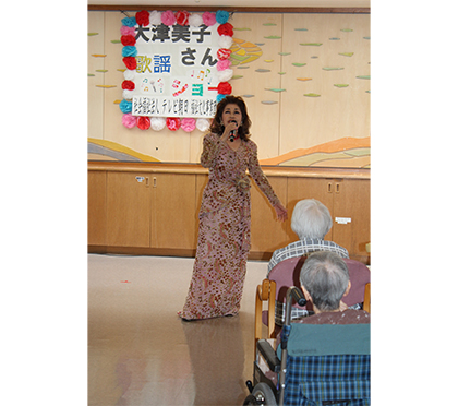 4月27日、世田谷区の特別養護老人ホーム「第2有隣ホーム」を大津美子さんが訪問して、歌謡ショーを行いました。当日は、気持ちの良い好天にも恵まれて、歌謡ショーを楽しみにしていた160人ほどの利用者や関係者の皆さんが、施設の1階フロアにある「有隣ケアセンター」に集まりました。