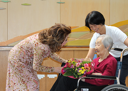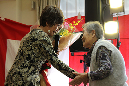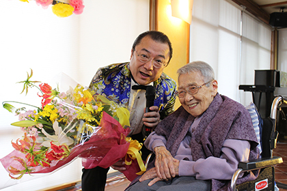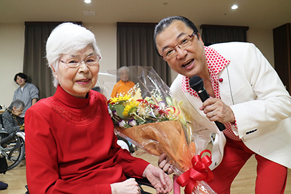 最後に、施設を代表した104歳のお年寄りから大きな花束を贈られ、参加者全員と記念写真を撮影し終演。参加者からは「大変感激しました。本当にありがとうございました」と感謝の言葉を頂きました。