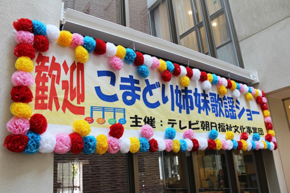 5月22日、西東京市の特別養護老人ホーム「クレイン」に、こまどり姉妹さんをお連れして歌謡ショーを行いました。当日は、初夏を思わせるような青空の晴天となり、90人を超える参加者が、手作りの花やプラカードを手にして集まりました。