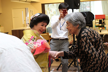 最後は、誰もが知る民謡「花笠音頭」(山形県)。会場の皆さんも手拍子、合唱し、大いに盛りあがると、施設を代表してお年寄りから花束を贈られました。「稲城繁盛節」のCDにサインしたり、参加者全員と記念写真を撮影後、「ありがとうございました!」と沢山の感謝の言葉に送られて、会場を後にしました。