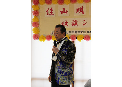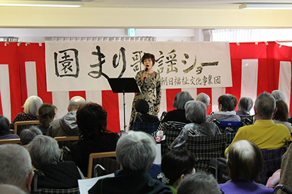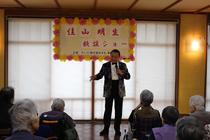 12月7日、武蔵野市の特別養護老人ホーム「親の家」に、佳山明生さんをお連れして歌謡ショーを行いました。この日は気温17℃、曇天でしたが、歌謡ショーが始まる頃には雲間に青空が見えはじめました。歌謡ショーを楽しみにしていた利用者やその家族の方々、地域の方々を含めて約90人が集まり、演歌を中心にアンコールを含めると7曲を熱唱しました。