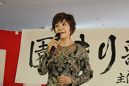 こまどり姉妹さんが、山本寛斎さんデザインの派手な衣装で登場すると、大きな拍手で歌謡ショーが始まりました。往年のヒット曲「ソーラン渡り鳥」から、デビュー曲「浅草姉妹」など全部で8曲を熱唱しました。こまどり姉妹さんの子供の頃の苦労を歌にした「三味線姉妹」、そして失恋の歌「未練ごころ」を切なく歌いました。また、こまどり姉妹さんの姉の栄子さんによる「二輪草」の見事な踊りも披露されるなど、ほんとうに楽しい会となりました。三味線コーナーでは、三味線の生演奏で「お吉物語」「岸壁の母」を熱唱すると、一緒に歌を口ずさむ方や感激して涙ぐむ方が見受けられました。また、今年80歳になったというこまどり姉妹さんたちが、「一日一日を素晴らしい日にできるように過ごすことが大切。この歳まで生きられてほんとうに感謝しています」と挨拶をすると、参加者は一応に頷いていました。