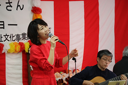 そして、いよいよ「稲城繁盛節」。リメイク版を原田さんと一緒に唄っている、お弟子さんの江島ちあきさんと2人で唄いました。地元の唄だけに、一緒に唄う方も多く、大いに盛りあがりました。