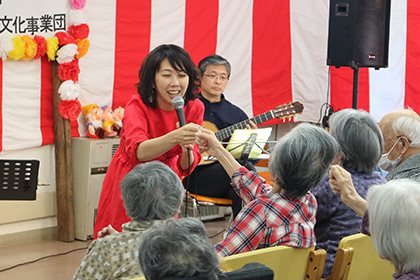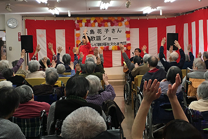 園さんは、ご自身の代表曲を中心に「何も云わないで」「太陽はひとりぼっち」「何でもないわ」など、全11曲を熱唱しました。園まりさん、中尾ミエさん、伊藤ゆかりさんはスパーク3人娘と呼ばれた国民的アイドルです。そのスパーク3人娘のツイストでもヒットした「太陽はひとりぼっち」を陽気に歌うと、「まりちゃん!」という大きな掛け声と手拍子で、会場にお年寄りの笑顔が溢れました。また、施設が事前に用意した歌詞カードを手に利用者の皆さんと一緒に「ふるさと」「青い山脈」を合唱。参加したお年寄りたちとの一体感が生まれ、元気いっぱいの大きな声が会場に響きわたりました。