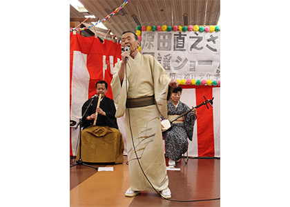 司会の早川さんの紹介で、原田直之さんが登場すると、大きな拍手でショーが始まりました。三味線、尺八、鳴り物、お囃子の生演奏で、原田さんの故郷の「新相馬節」(福島県)から「大漁唄い込み」(宮城県)を熱唱。続いて尺八の伴奏で「南部牛追唄」(岩手県)を歌うと会場に原田さんの済んだ声が響き、「佐渡おけさ」(新潟県)、「ソーラン節」(北海道)では手拍子と大きな拍手で、会場は盛り上がりました。福島県浪江町出身の原田さんから、「東日本大震災から8年が経とうとしているが、まだ自宅に戻れない人がいる。大震災のことを決して忘れないようにしたい」と故郷へ思いを熱く語りました。原田さんがお色直しをしている間、司会の早川さんのトークコーナーや、お弟子さんの堀さん、江島さんのお二人が「安里屋ユンタ」「浪花節だよ人生は」を披露しました。