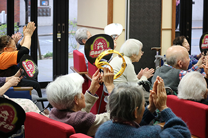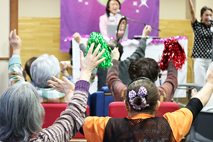 初会場となった高齢者総合福祉施設「神楽坂」(新宿区)では、集まった皆さんに懐かしい音楽に合わせて身体を動かしていただき、笑顔と元気をお届けすることができました。