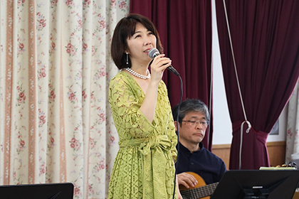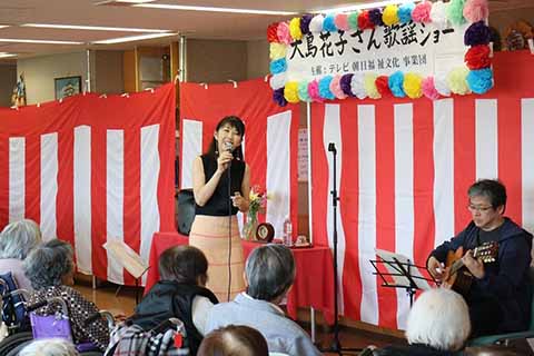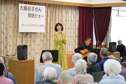 6曲目は坂本九さんのヒット曲「幸せなら手をたたこう」。この施設でよく歌っているだけに、足を鳴らしたり、お隣りの方と「どうもどうも」と挨拶したり、みなさん楽しそう。続いて「故郷」、「赤とんぼ」と懐かしい唱歌を披露しました。岩に染み入る水のように、人の頭の芯まで染み込み癒してくれる大島さんの歌声。この安らぎは、父、坂本九さんのDNAならではないでしょうか。