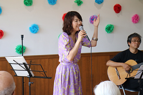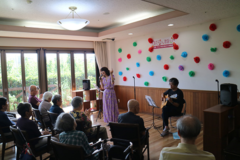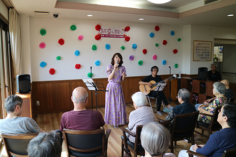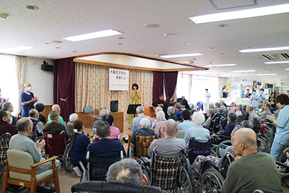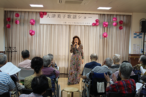 8月20日、座間市の特別養護老人ホーム「太陽の家座間」で、大津美子さんの歌謡ショーを開催しました。当日は、お盆明けの残暑で、猛暑日にもかかわらず、歌謡ショーを心待ちにしていた約100人の利用者やご家族の皆さんが、1階の「地域交流スペース」に集まりました。
