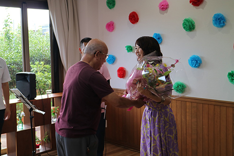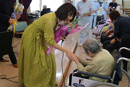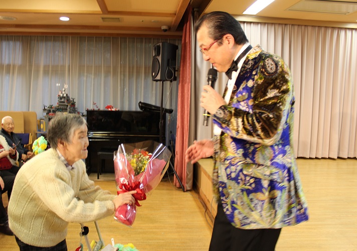 最後に、利用者の代表者から感謝の気持ちを表して、大津美子さんに綺麗な花束が贈呈され、全員で記念撮影を行って終演となりました。参加した職員の方からは「お年寄りの笑顔がほんとうに良かったです。ありがとうございました」との感謝の言葉をいただきました。