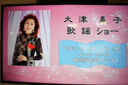 4月17日、新宿区の高齢者福祉施設「神楽坂」に、大津美子さんをお連れして歌謡ショーを行いました。高齢者施設訪問は,今回の大津さんの歌謡ショーで233回を数え、平成最後となった今回の歌謡ショーを心待ちにしていた約90人の利用者や地域の皆さんが、早稲田通りに面した施設の「地域交流スペース」に集まりました。