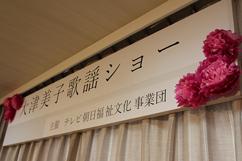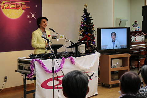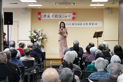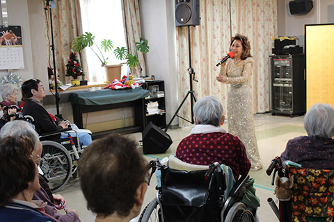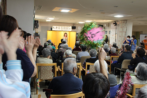 12月23日、足立区の特別養護老人ホーム「さの」で、大津美子さんの歌謡ショーを開催しました。前日から降っていた雨が心配されましたが、早朝にはすっきり上がって、青空の広がる気持ちの良い好日となりました。約90人の利用者や職員の皆さんが、施設1階の「食堂スペース」に集まりました。