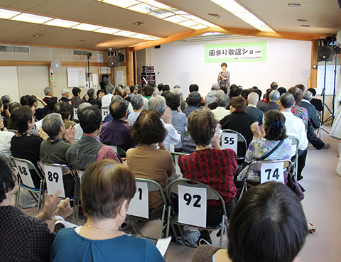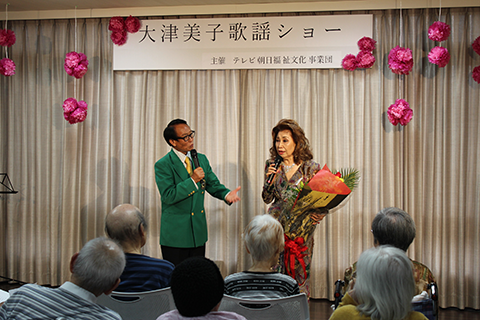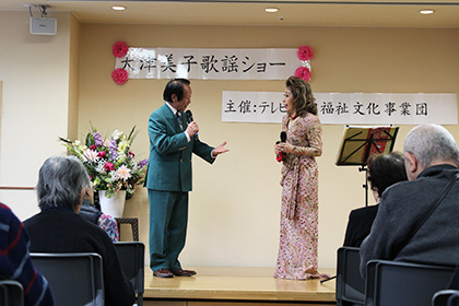 大ヒットした「東京は恋人」では、大きな手拍子とともに、歌に合わせて手作りのうちわを振る方や、一緒に口ずさんでおられる方などがおられ、会場はたいへん盛り上がりました。また、石原裕次郎さんのヒット曲「恋の町札幌」「湖畔の宿」「さよならルンバ」をメドレーで歌いました。司会の早川さんとのトークコーナーでは、和やかな雰囲気の中で、会場にお年寄りの笑顔が溢れていました。