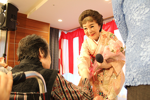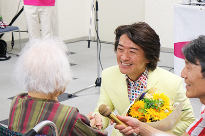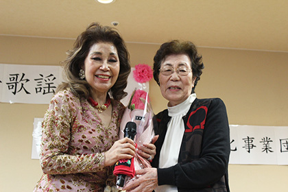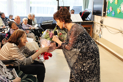 かつてテレビ番組で中尾ミエさん、伊藤ゆかりさんと共に「スパーク3人娘」を結成した園さん。その中尾ミエさんの代表曲「可愛いベイビー」、伊藤ゆかりさんの「ヴァケーション」を陽気に歌うと、会場から大きな掛け声と手拍子で盛り上がり、会場にお年寄りの笑顔が溢れました。また、利用者の皆さんと「ふるさと」を合唱すると、童心に返ったお年寄りたちの元気いっぱいの大きな声が会場に響き渡りました。今回、初めて披露したというテレサ・テンさんの「時の流れに身をまかせ」では、多くの参加者が一緒に口ずさんでいました。往年のヒット曲「夢は夜ひらく」「逢いたくて逢いたくて」「愛燦燦」を歌った後に、施設を代表したお年寄りから大きな花束が園さんに贈られました。