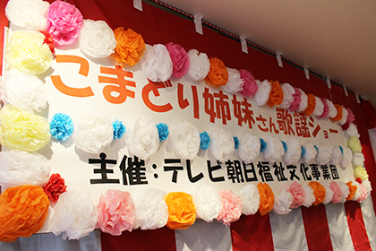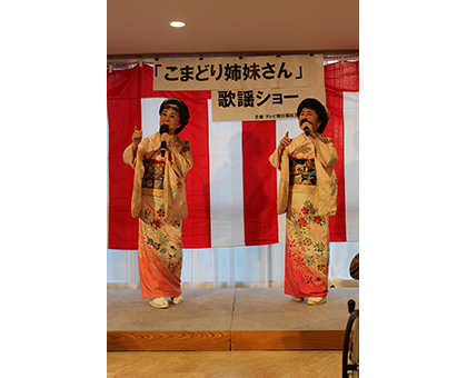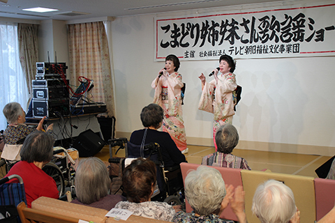 10月3日、足立区の特別養護老人ホーム「古千谷苑」で、こまどり姉妹さんの歌謡ショーを開催しました。当日は、天候にも恵まれて、歌謡ショーを楽しみにしていた入所者、近隣の特養の利用者など115人が集まりました。