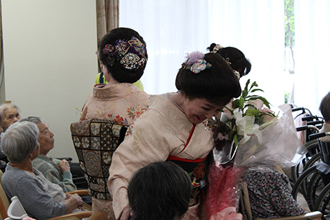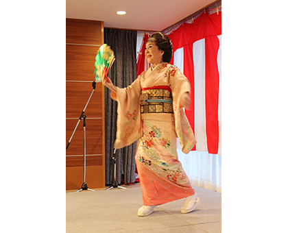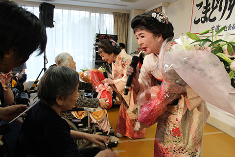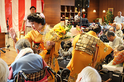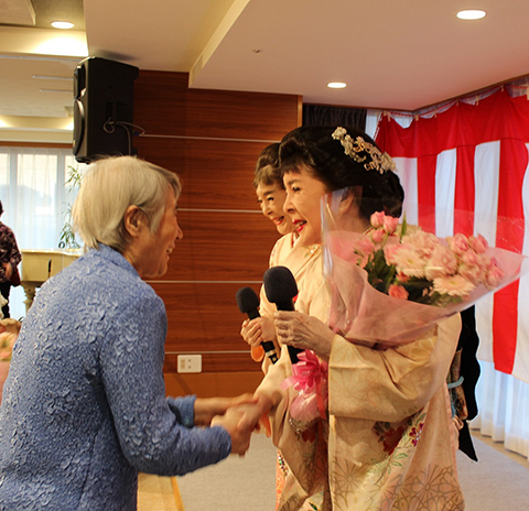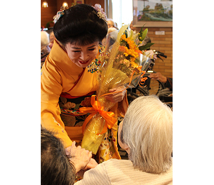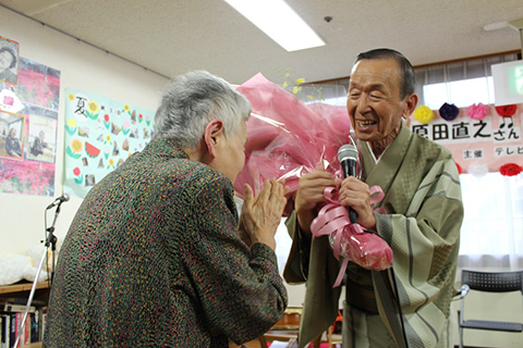 最後は、誰もが知る民謡「花笠音頭」(山形県)。会場の皆さんも手拍子、大合唱し、大いに盛りあがると、施設を代表してお年寄りから花束を贈られました。