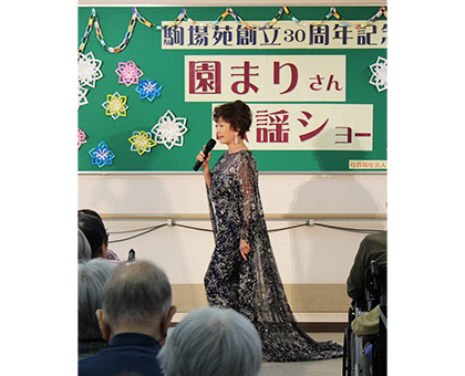 6月12日、目黒区の特別養護老人ホーム「駒場苑」に、園まりさんをお連れして歌謡ショーを開催しました。駒場苑は、今年30周年を迎えるため「30周年記念コンサート」としての催しとなりました。当日は、今にも雨が降り出しそうな梅雨空でしたが、比較的涼しく過ごしやすい日となりました。歌謡ショーを楽しみにしていた利用者・ご家族の方々115人ほどが、会場となった施設1階ホールを埋め尽くすように集まりました。