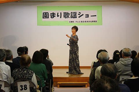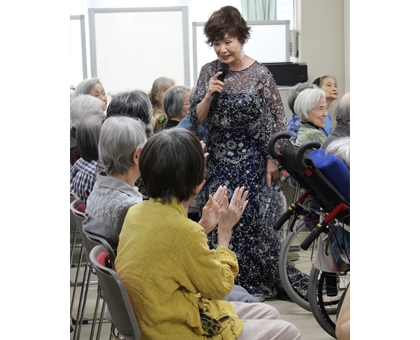 園さんは、ご自身の代表曲を中心に全11曲を熱唱しました。歌手デビューのきっかけともなったオーディションで歌った大津美子さんの「ここに幸あり」を、施設が用意してくれた歌詞カードを手にした利用者さんたちと一緒に合唱。感激して思わず涙ぐむお年寄りの姿も散見されました。