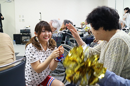 「ソウル・トレイン・・・」では機関車の車輪ようにシュッシュッポッポと両手を動かしたり、「ズンドコ節」ではお芋を掘って担ぐ動きをしたり・・・。みなさんが上手に踊る秘密は、開場から開演までの間、「のんちゃん」こと、介護福祉士ダンサーの野毛さんがオッシーさんと考案した振付けを、チアガール二人と入念に教えてくれたから。だれもが参加しやすい動きになっています。