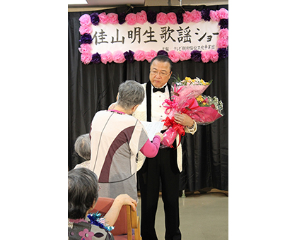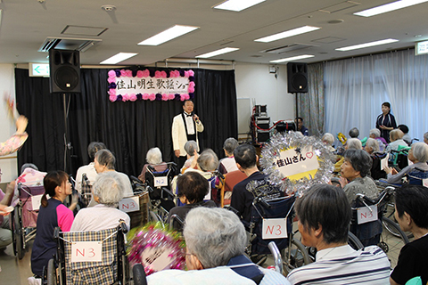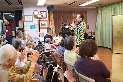10月15日、東久留米市の特別養護老人ホーム「けんちの里」に、佳山明生さんをお連れして歌謡ショーを行いました。当日はどんよりとした雲がたれこめて、今にも雨が降り出しそうな天気でしたが、歌謡ショーを楽しみにしていた利用者や関係者など約100人が、会場となった地域交流室に集まりました。往年の歌謡曲を中心にアンコールを含め全7曲を熱唱しました。