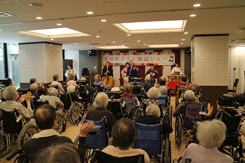 11月6日、板橋区の特別養護老人ホーム「サニーヒル板橋」で、こまどり姉妹さんの歌謡ショーを開催しました。当日は、抜けるような青空で雲一つない秋晴れとなりました。訪問した「サニーヒル板橋」は、8月に開所したばかりの新しい施設。イベントの開催も今回が初めてだということでしたが、会場となった1階ホールには、歌謡ショーを心待ちにしていた利用者、その家族など約100人が集まりました。