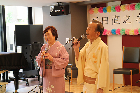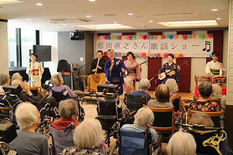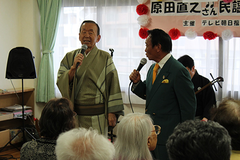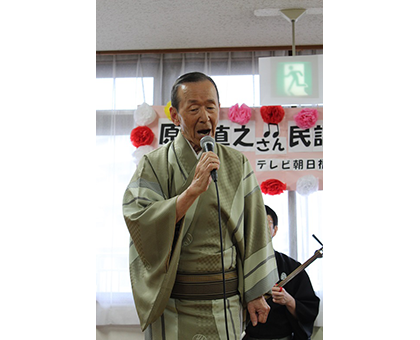 7月19日、東京・品川区に完成して間もない特別養護老人ホーム「グランアークみづほ」に原田直之さんをお連れして、民謡・歌謡ショーを開催しました。入居者やご家族の方、関係者を含めて70人ほどが、会場に集まりました。