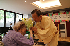 最後に、利用者の代表者から感謝の気持ちを表して、大津美子さんに綺麗な花束が贈呈され、全員で記念撮影を行って終演となりました。前の方におられた方が、大津さんに「ほんとうに素晴らしい歌をありがとうございます。このまま、100歳までも元気に歌い続けてください」との励ましの言葉をかけると、大津さんも「ありがとう。頑張ります」と笑顔で答えておられました。