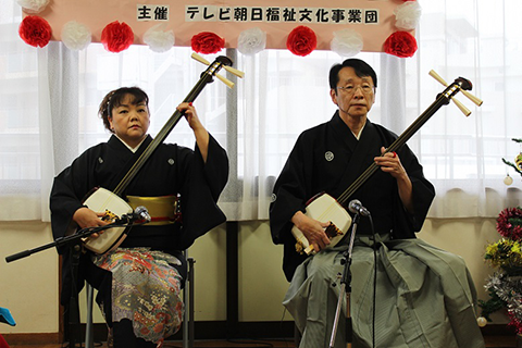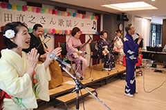 続いて日本を代表する民謡「佐渡おけさ」(新潟県)、「南部牛追い歌」(岩手県)、「ソーラン節」(北海道)を披露。会場はさらに大盛りあがりで、皆さんの手拍子が会場に鳴り響きました。尺八の米谷和修さんがメドレーでみんながよく知っている名曲を披露。村田英雄さんの「王将」のイントロが流れると、自然と尺八に合わせての大合唱になりました。その後、津軽三味線コーナーでは、久保木夫妻が息もピッタリで津軽三味線を演奏しました。