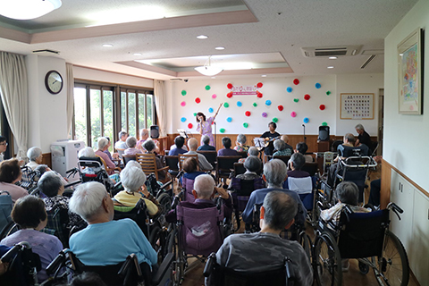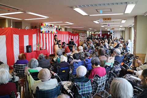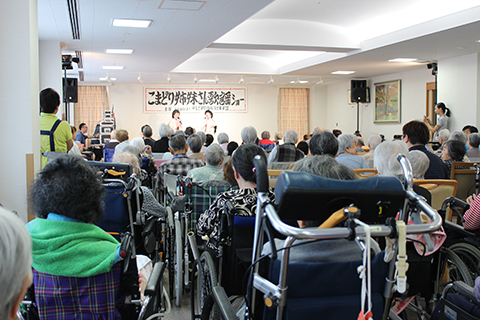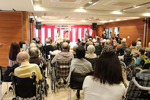 5月17日、厚木市の特別養護老人ホーム「グランモールさくら及川」を訪問して、こまどり姉妹さんの歌謡ショーを開催しました。当日は、初夏を思わせるような陽気で夏日を記録。天候に恵まれたので、スライドドアを開放してパティオ(中庭)から新鮮な空気が入ってくる会場となった1階パティオラウンジには、歌謡ショーを心待ちにしていた入所者、利用者など123人が集まりました。