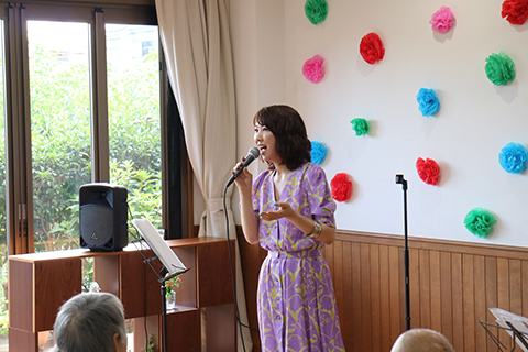 行く夏を惜しむように太陽が照り気温は32℃、残暑が戻った8月29日、稲城市の介護付有料老人ホーム「ペアウェル多摩川」に大島花子さんをお迎えし、利用者やご家族、お孫さんなど80人が歌謡ショーを楽しみました。